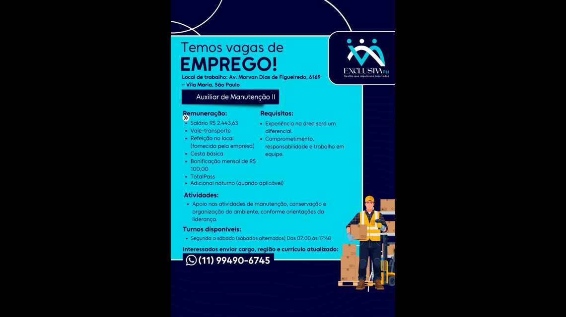📢 VAGA ABERTA – AUXILIAR DE MANUTENÇÃO II