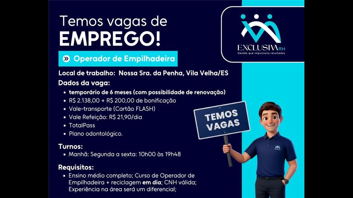 📢 VAGA: OPERADOR DE EMPILHADEIRA (SOMENTE) ELETRICA